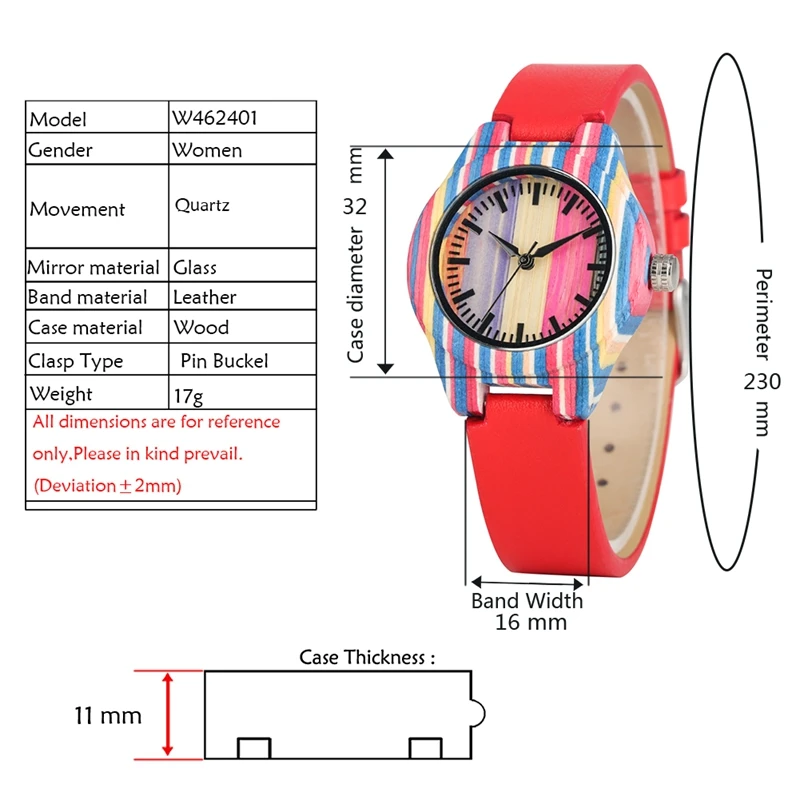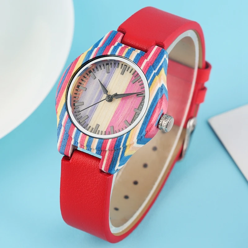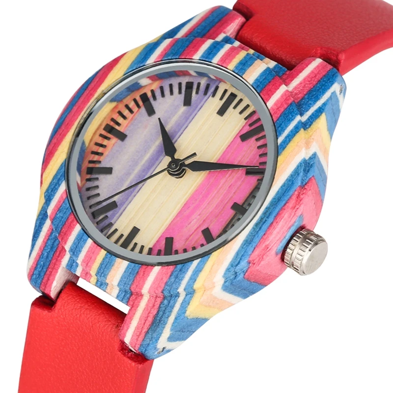 Multicolor Wood Bamboo Wood Watch for Women Fashion Stripes Clock Female Red Leather Bracelet Watch